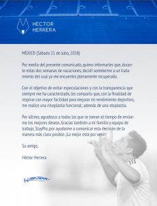 Además el jugador mexicano dio a conocer mediante un comunicado de prensa que la rinoplastia funcional a la que se sometió fue con la finalidad de respirar con mayor facilidad y mejorar su rendimiento deportivo.