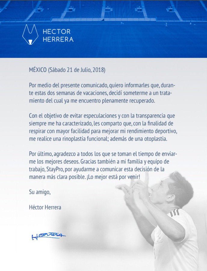 Luego de someterse a dos cirugías estéticas el mediocampista mexicano, Héctor Herrera mostró su nuevo rostro mediante unos vídeos en Twitter en donde anunciaba su incorporación en el Fútbol Club Porto.