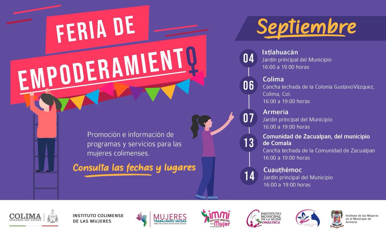 A partir del 4 de septiembre se podrá disfrutar de la Feria de Empoderamiento que el gobierno del estado a través del Instituto Colimense de las Mujeres llevará a cabo con el propósito de dar promoción e información de programas y servicios para las mujeres colimenses.
