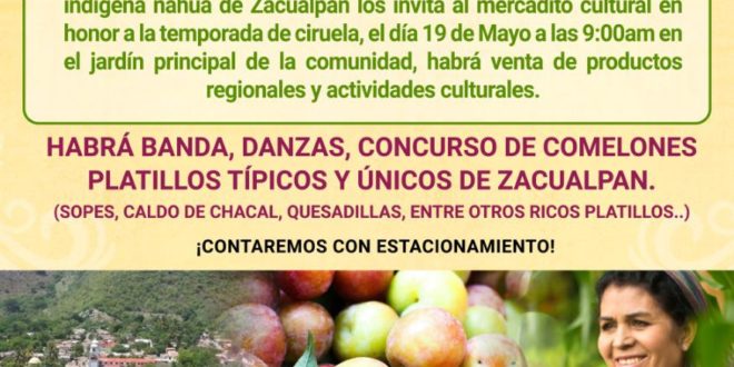 La comunidad indígena nahua de Zacualpan nos invita al #MercaditoCultural “Temporada de ciruelas”, a celebrarse el próximo domingo 19 de Mayo a partir de las 9 am.
